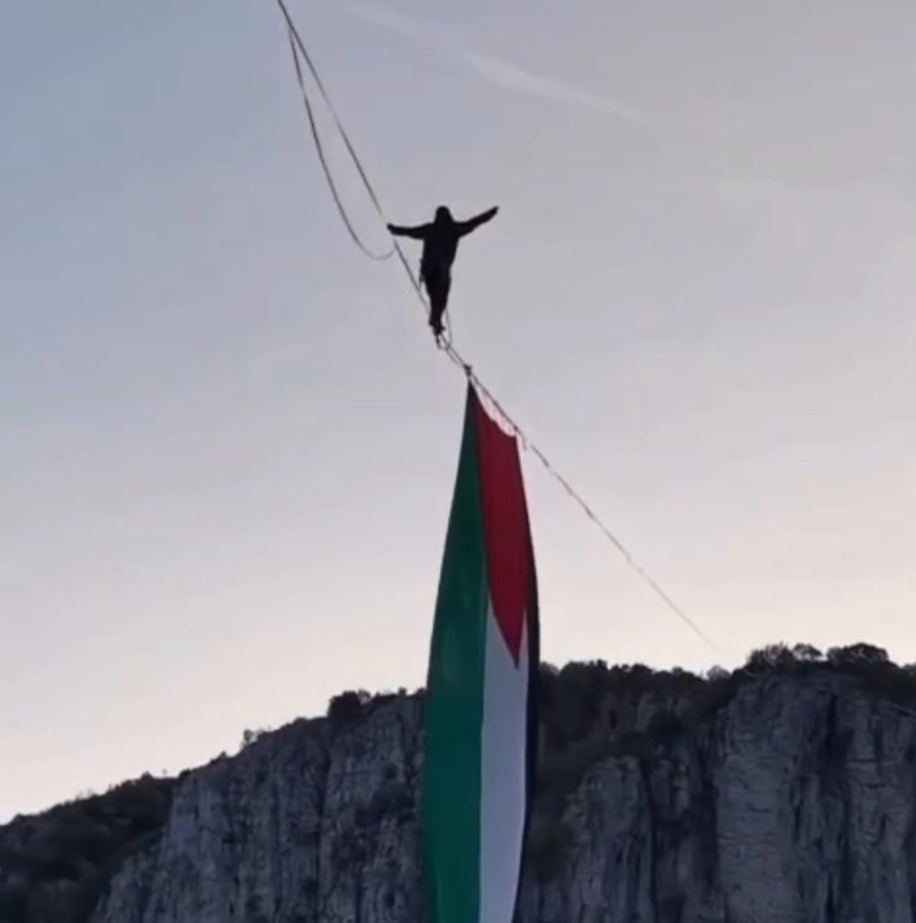 Un militant pro-palestinien a participé à une traversée périlleuse de la gorge de Vikos, en Grèce, sur une Highline à 850 mètres au-dessus du sol. Une ligne d’un kilomètre était tendue entre les falaises, le drapeau palestinien flottant fièrement entre elles.