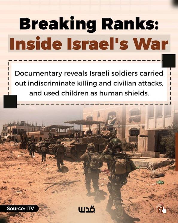 Dans le nouveau documentaire « Breaking Ranks : Inside Israel’s War », (Rompre les rangs : la guerre israélienne de l’intérieur), produit par la chaîne britannique ITV, une douzaine de soldats israéliens témoignent des massacres indiscriminés à Gaza, l’utilisation de civils comme boucliers humains et la destruction de quartiers entiers sans provocation.