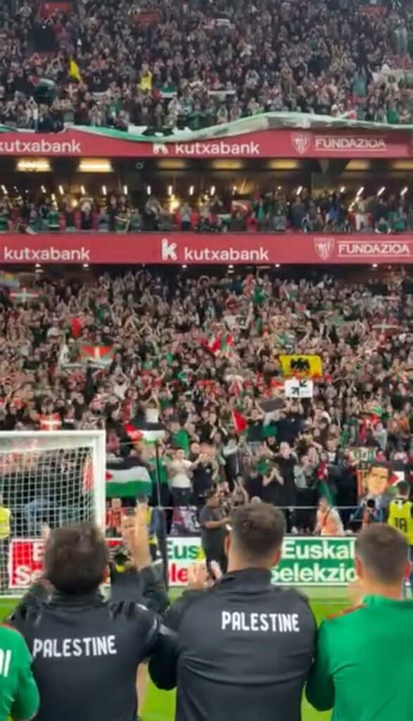 Beaucoup de scènes émouvantes de solidarité avec le peuple palestinien, pendant ce match de foot au stade San Mamés, domicile du club espagnol Athletic Bilbao, entre le Pays Baque et la Palestine.