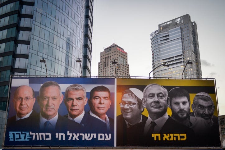 » À gauche : « Le peuple d’Israël vit en bleu et blanc » avec Gantz et Lapid ; à droite : « Le kahanisme est vivant » avec Ben-Gvir, Bibi, Smotrich et Meir Kahane. Généralement, la radicalisation de la droite entraîne celle de la gauche. Mais en Israël, c’est l’inverse qui s’est produit. Tandis que la droite se radicalisait, la gauche s’est recentrée. Elle a brouillé ses positions, s’est alignée sur la droite, a tenté de l’imiter et s’est retrouvée dans une situation des plus défavorables.