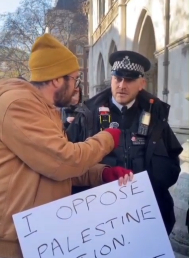 Interrogé par un militant pro-palestinien sur le risque d’arrestation pour avoir brandi une pancarte soutenant le génocide israélien à Gaza, un policier britannique a répondu : « Je n’ai pas d’avis. »