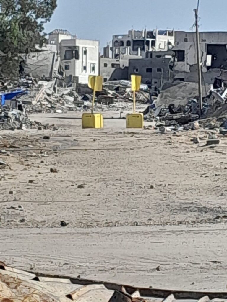 Et dimanche, comme chaque jour, l’armée israélienne a repoussé la « Ligne jaune » encore plus profondément dans la ville de Bani Suheila, à l’est de Khan Younès, en violation flagrante de l’accord de cessez-le-feu. Des soldats ont placé de nouveaux cubes jaunes pour délimiter la zone interdite étendue, une zone dont tout Palestinien qui s’approche est automatiquement pris pour cible.