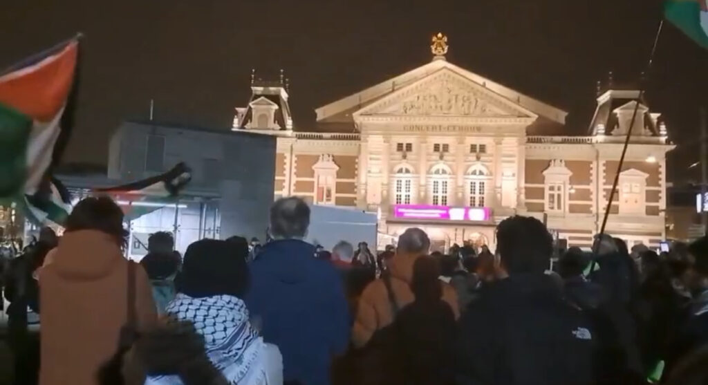 « Pas de place pour le génocide ! » Des manifestants se sont rassemblés devant le Concertgebouw à Amsterdam pour dénoncer la présence et la prestation d’un soldat israélien et apologiste d’Israël, Shai Abramson.