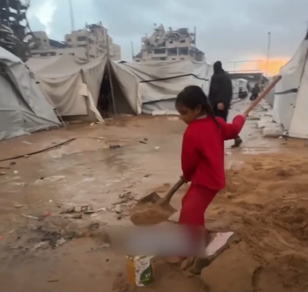 Dans la zone d’Al-Mawasi, à Khan Younès, c’est sous un froid glacial, balayée par des vents violents et des pluies incessantes, qu’une enfant s’efforce d’empêcher l’eau d’envahir la tente familiale, en allant remplir des seaux de sable pour construire une barrière…