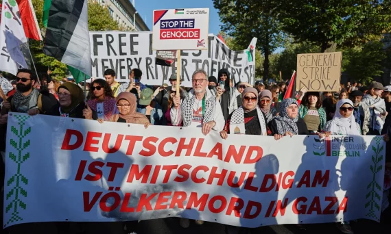 Quelque 100.000 personnes (« au moins 60.000 » selon la police) ont défilé samedi à Berlin, à l’occasion de la plus grande manifestation de solidarité avec le peuple palestinien de l’histoire de la capitale allemande. CAPJPO-EuroPalestine