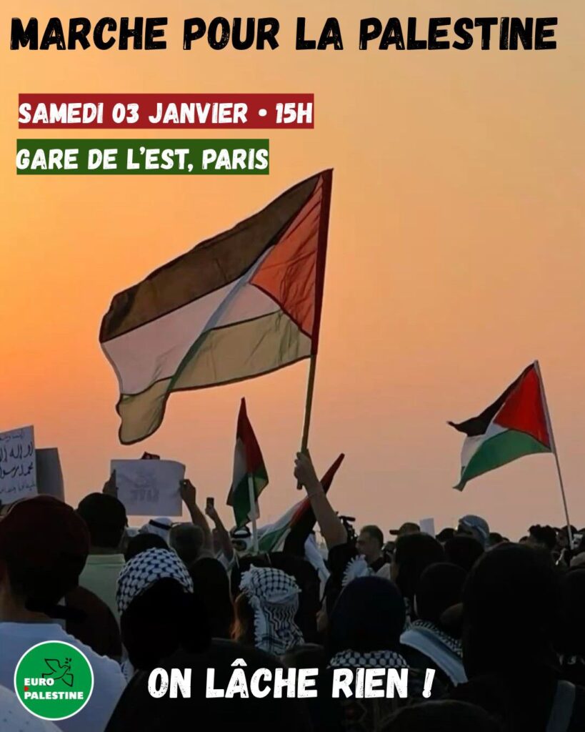 Nous vous attendons nombreux à la Marche pour la Palestine à Paris, samedi 3 janvier, départ 15h Gare de l’Est (Place Madeleine-Braun). L’appel d’Olivia Zémor, ci-dessous :