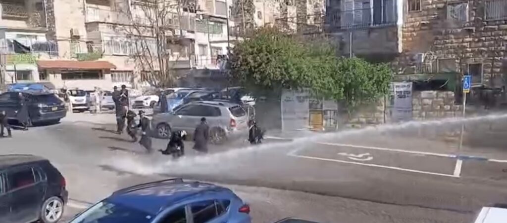La police israélienne utilise des canons à eau pour disperser de force les juifs haredim qui protestent contre la conscription obligatoire dans l’armée israélienne.