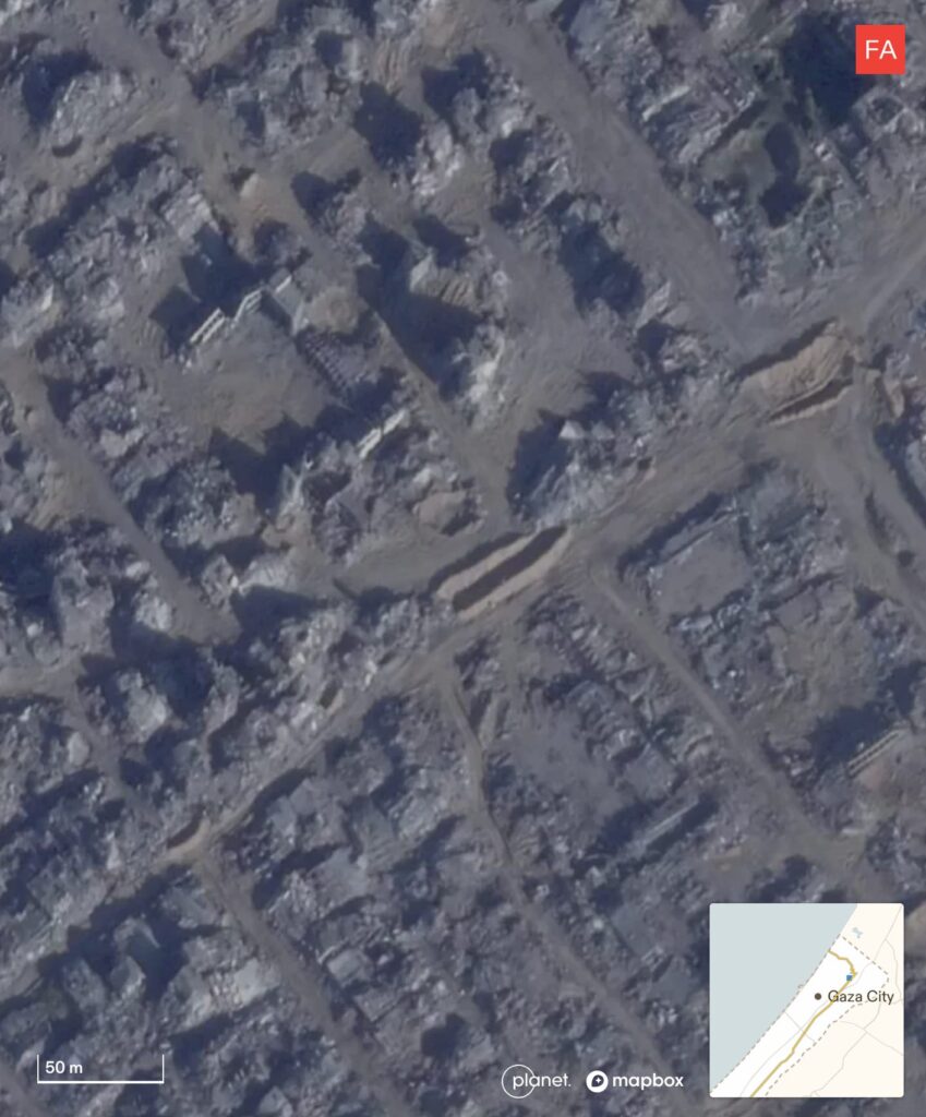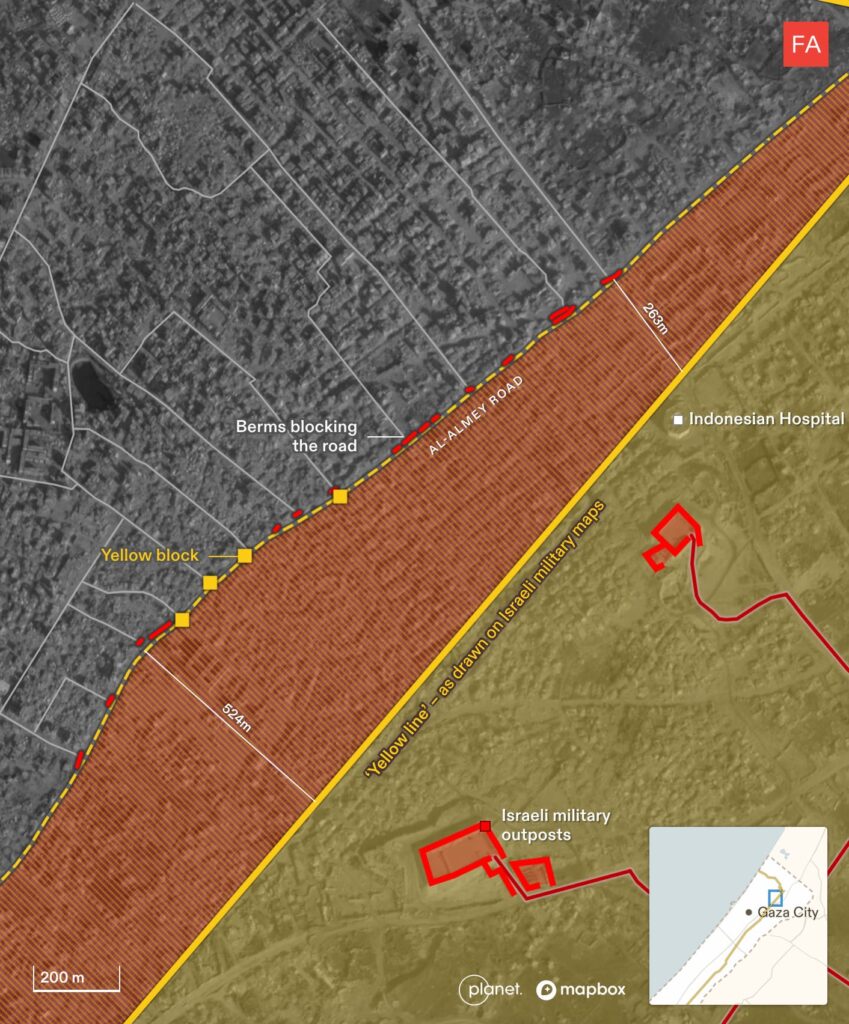 Le laboratoire Forensic Architecture (FA), qui documente la colonisation de la Palestine par Israël, a exploité des photographies satellitaires de la bande, prises entre décembre 2025 et le 17 janvier 2026.