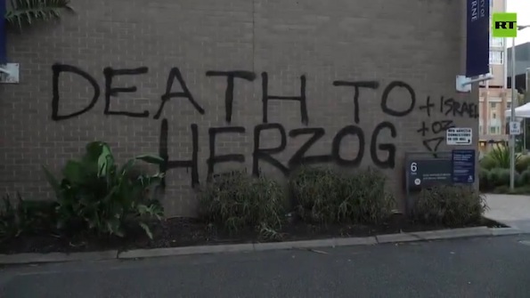 Des graffitis portant l’inscription « Mort à Herzog » ont recouvert un mur de l’Université de Melbourne.