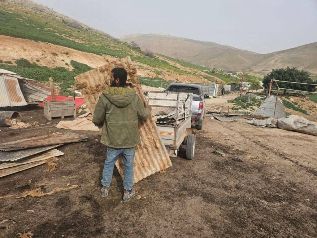 Abandonnées sans protection ni soutien, des familles palestiniennes démantèlent leurs maisons à Al-Burj, dans le nord de la vallée du Jourdain, en prévision de leur départ face à l’intensification des attaques des colons.