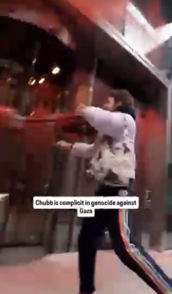Les militants de People Against Genocide (Peuple contre le génocide) ont organisé un blocage devant les locaux de Chubb à Londres après que la société a commencé à assurer l’usine de moteurs pour drones d’Elbit Systems, permettant ainsi au fabricant israélien de drones d’opérer au Royaume-Uni.