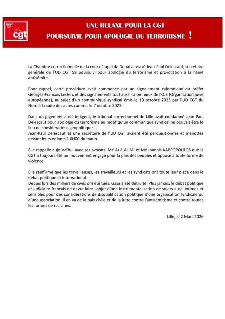 Condamné en première instance à un an de prison avec sursis par le tribunal correctionnel de Lille, après des signalements du préfet Leclerc et de l’OJE concernant un communiqué syndical du 10 octobre 2023 à propos de l’attaque du 7 octobre 2023, Jean-Paul Delescaut de l’UD CGT Nord est relaxé par la cour d’appel de Douai qui a remis les pendules à l’heure !
