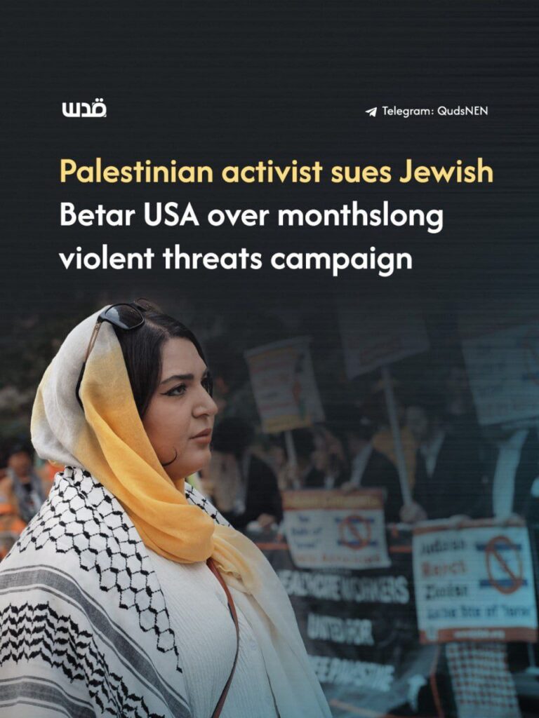 La militante palestino-américaine Nerdeen Kiswani, fondatrice de l’organisation Within Our Lifetime (Pendant notre Vie), a déposé une plainte fédérale pour violation des droits civiques contre le Betar USA, suite à une campagne de menaces violentes, de harcèlement et d’intimidation qui a duré plusieurs mois.