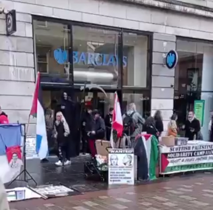 Devant une agence Barclays à Glasgow, des militants ont protesté samedi contre l’agression israélo-américaine en Iran et ont critiqué les liens financiers de la banque avec les entreprises d’armement ainsi que son rôle dans le financement d’activités militaires liées au régime israélien.