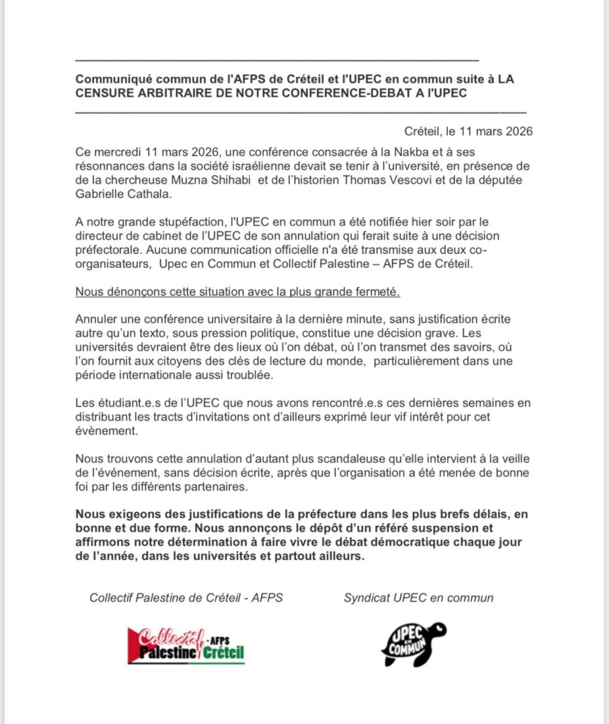 Je devais intervenir ce soir à l’Université de Créteil pour une conférence dédiée à la Nakba aux côtés de Muzna Shihabi & Thomas Vescovi.