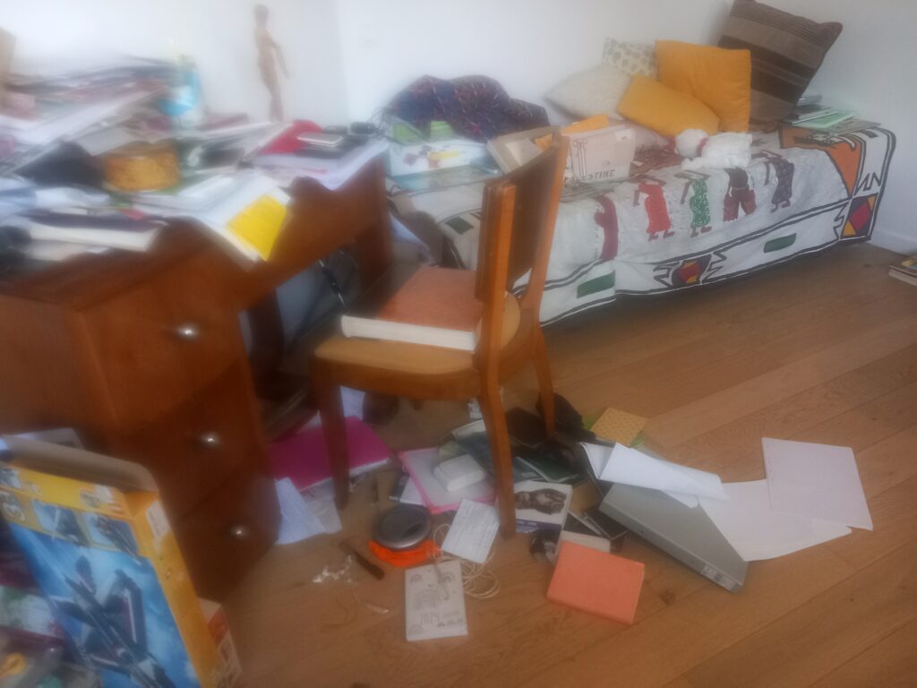 Grands coups frappés à 6 H du matin jusqu’à ce que l’on comprenne que c’était la police. Huit personnes cagoulées entrent chez nous à l’Ile Saint-Denis et immobilisent Nicolas Shahshahani, m’interdisant de m’approcher de lui. Puis se mettent à fouiller la maison mettant nos affaires sens dessus dessous.