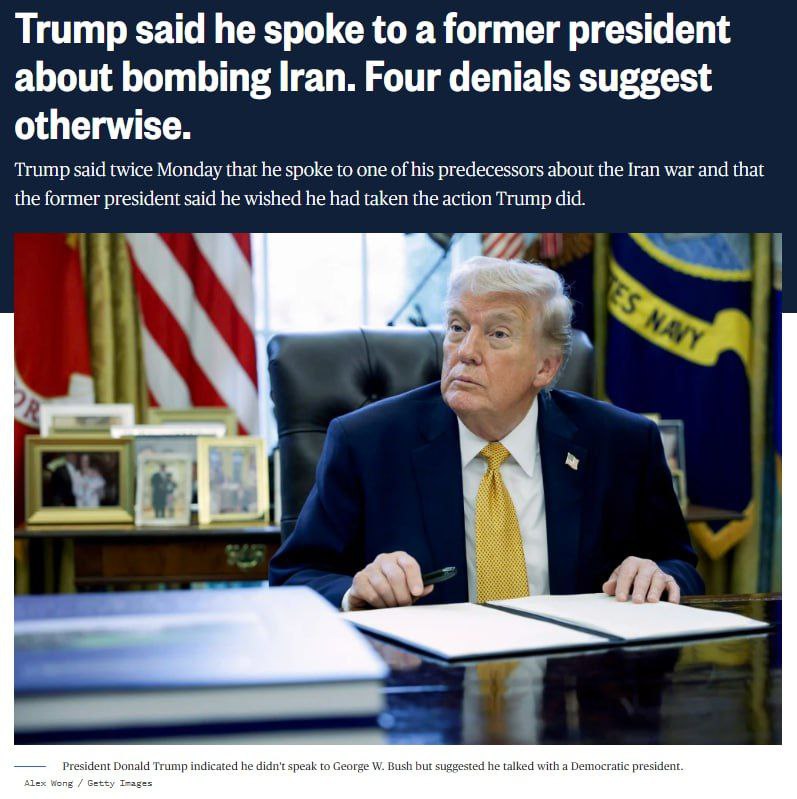 Trump a déclaré avoir parlé avec un ancien président américain qui lui aurait confié regretter de ne pas avoir bombardé l’Iran, mais les collaborateurs des quatre anciens présidents encore en vie, George W. Bush, Bill Clinton, Barack Obama et Joe Biden, ont nié qu’une telle conversation ait eu lieu, rapporte NBC News.