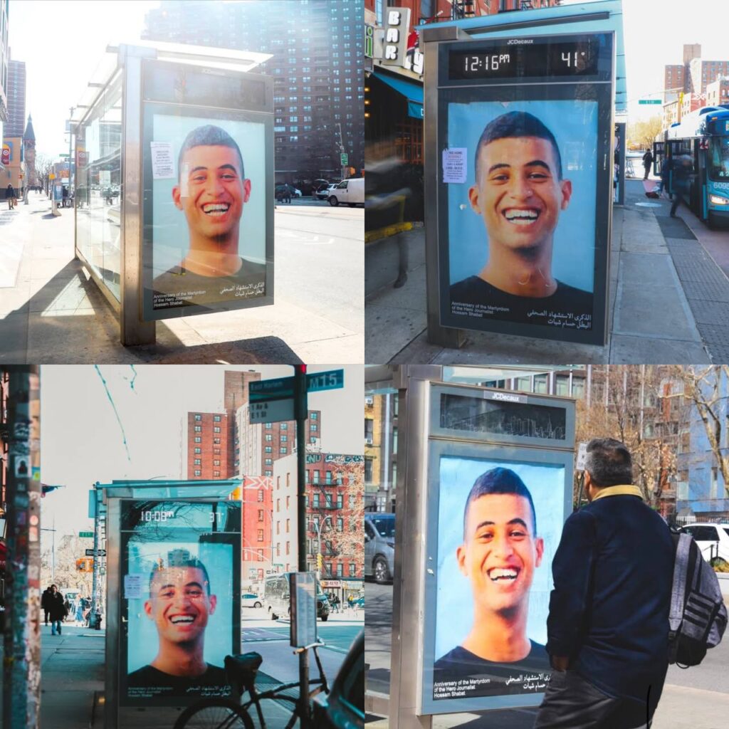 À l’occasion de l' »anniversaire » de son assassinat par Israël dans le nord de Gaza, des affiches rendant hommage au journaliste palestinien Hossam Shabat, âgé de 23 ans, ont été placardées dans les rues de New York.