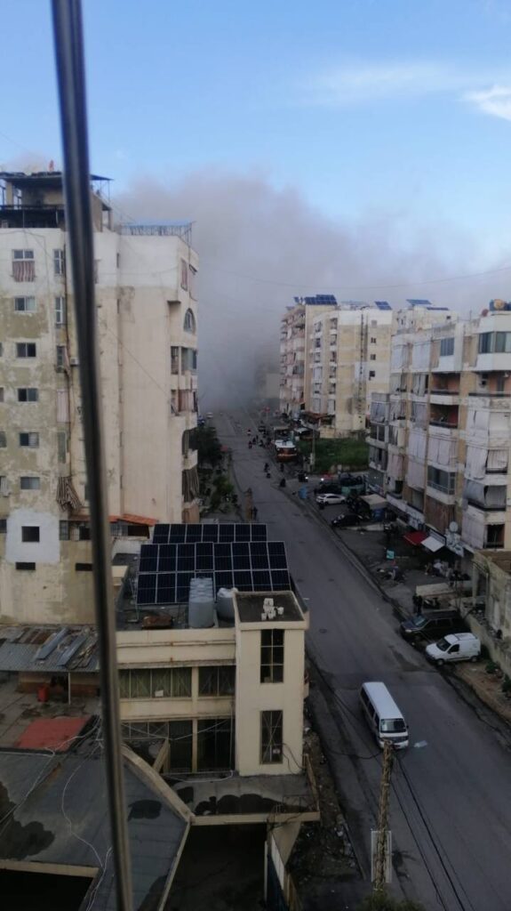 Conséquences du bombardement israélien d’un immeuble résidentiel dans la banlieue sud de Beyrouth plus tôt dans la journée de vendredi.