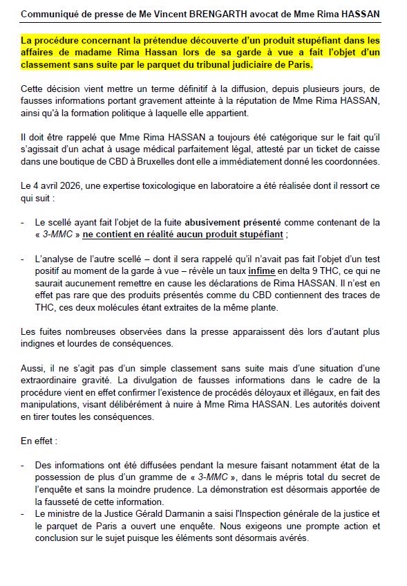Communiqué de presse, jeudi, de M° Vincent Brengarth, l’avocat de Rima Hassan :