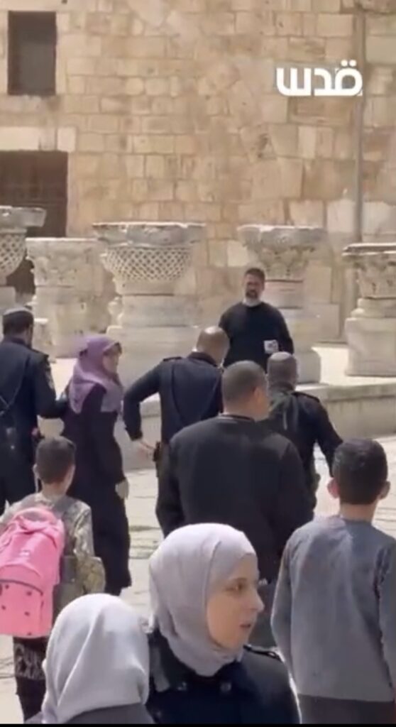 On peut voir les forces israéliennes expulser deux femmes palestiniennes dans l’enceinte de la mosquée Al-Aqsa, à Jérusalem et les embarquent en détention