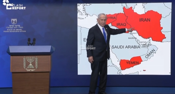 Dans un communiqué de presse en hébreu uniquement, Netanyahu a déclaré aux Israéliens que la guerre contre l’Iran n’était pas terminée et qu’il continuerait de « vaincre l’Iran et ses alliés ». Il a présenté une carte montrant l’Iran, l’Irak, le Liban, le Yémen et Gaza, affirmant qu’Israël était en train de les vaincre tous. Il est à noter que la Syrie a également été présentée comme un allié de l’Iran et un ennemi d’Israël., même si le gouvernement syrien s’est ouvertement opposé à l’Iran et a bloqué les transferts d’armes vers le Liban avec le soutien des pays du Golfe. La carte révèle le véritable objectif d’Israël : occuper davantage de territoire syrien, quel que soit le parti au pouvoir.
