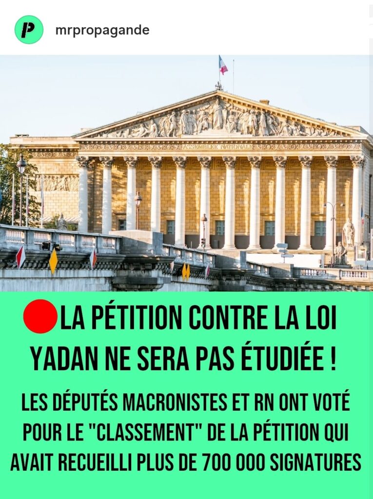 Le compteur, sur le site de l’Assemblée Nationale, se retrouve ainsi bloqué depuis la mi-journée à 707.957 signatures, plus personne ne pouvant signer ! Rappelons que règlementairement, dès qu’une pétition de ce type, c’est-à-dire organisée dans le cadre de l’Assemblée Nationale, atteint les 500.000 signatures, un débat public est de droit. Mais le droit, Yadan et ses complices s’assoient dessus, une fois de plus.