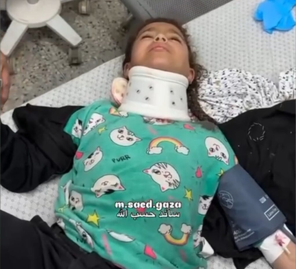 L’enfant palestinienne Zeina Battah a été grièvement blessée après avoir été touchée au cou par des tirs de chars d’occupation israéliens dans la ville de Beit Lahia, au nord de la bande de Gaza.