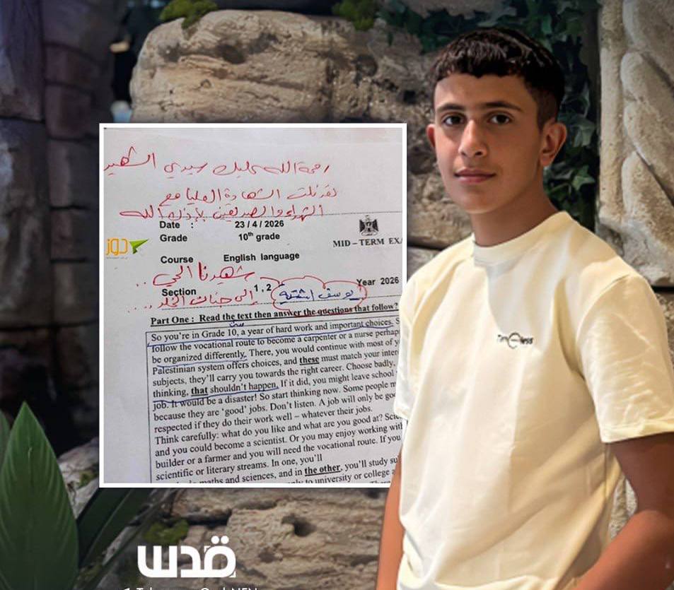 Ahmed Atallah, un professeur palestinien, partage une photo de la copie d’examen d’anglais de son élève, Yusuf Ashtiyeh, tué alors qu’il quittait son école lors d’un raid sur la ville de Naplouse, en Cisjordanie occupée.