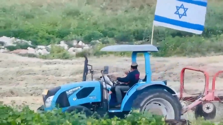 Le colon Elyashiv Nachum, propriétaire de l' »avant-poste » colonial « Havat Yehuda », ainsi que d’autres colons, envahissent des terres palestiniennes privées en Cisjordanie, dans le village de Wadi Tiran avec un tracteur et récoltent du blé dans le but de prendre le contrôle de la zone.