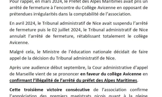 La Cour administrative d’appel de Marseille a confirmé vendredi l’illégalité de la fermeture administrative du Collège Avicenne, premier établissement d’éducation musulman dans le département des Alpes-Maritimes. Le communiqué du Collège et de son avocat, ci-dessous : CAPJPO-EuroPalestine