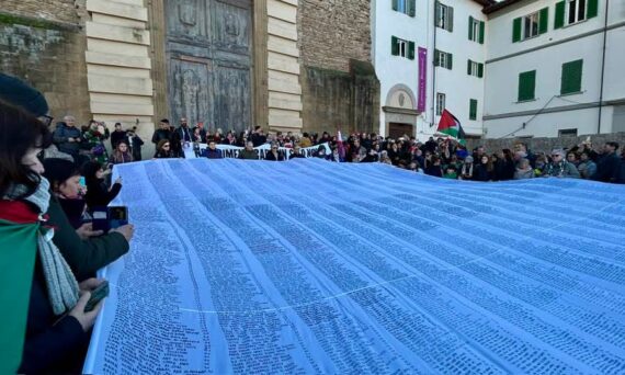 Une grande banderole de 25 mètres de long, portant les noms des 18 457 enfants et jeunes tués dans la bande de Gaza a été déployée sur la Place du Carmine à Florence CAPJPO-Europalestine