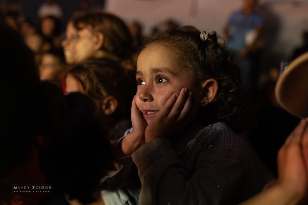 Des enfants de Gaza se rassemblent autour d’un petit écran dans un camp de réfugiés, partageant des moments de joie en regardant un film. Une brève parenthèse dans la dure réalité qui les entoure.