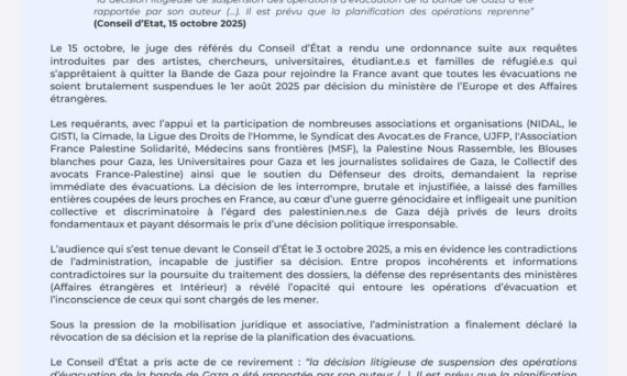 Attaqué en justice par une série d’associations pour sa scandaleuse interruption des évacuations de familles désunies et blessés palestiniens de la bande de Gaza, le gouvernement français a « révoqué » sa propre mesure, sans garantie qu’il s’y conformera concrètement. Les demandeurs (voir communiqué ci-dessous) avaient déposé une requête auprès du Conseil d’État, qui a tenu séance […]