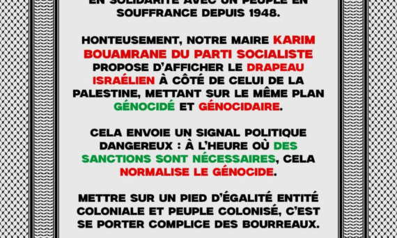 Karim Bouamrane, maire PS de Saint-Ouen, a eu une fameuse idée : hisser ce lundi le drapeau israélien à côté du drapeau palestinien ! Mais cette ignominie suscite de vives réactions un peu partout, qui risquent de l’amener à changer d’avis. Nous le lui souhaitons. CAPJPO-Europalestine