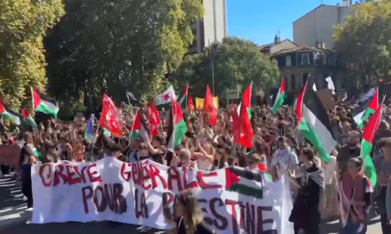 Manifestation à Toulouse, en soutien au peuple palestinien. « Grève générale pour la Palestine ! ». Les manifestants exigent la démission de Macron, la fin du génocide à Gaza et la libération des militants de la Flottille. CAPJPO-Europalestine