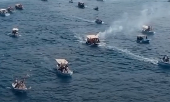 Manifestation en mer organisé jeudi, au large des côtes méditerranéennes de Hatay, en Turquie, pour exprimer leur solidarité avec la flottille Sumud CAPJPO-Europalestine