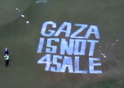 Palestine Action a ciblé le terrain de golf de Trump à Turnberry, en Écosse, en écrivant « GAZA N’EST PAS À VENDRE » sur la pelouse, et décorant sa maison. ET QUELQUES TROUS SUPPLÉMENTAIRES SUR LE TERRAIN DE GOLF, ÇA PEUT TOUJOURS SERVIR ? CAPJPO-Europalestine