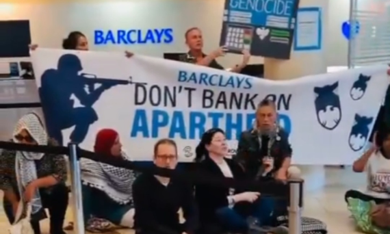 Des militants ont occupé la succursale de la Barclay’s Bank à Harrow, en Angleterre, pour protester contre son financement du génocide d’Israël à Gaza, ce qui a entraîné la fermeture anticipée de la banque. C’était l’une des nombreuses protestations contre les liens financiers de la banque avec le régime israélien génocidaire. CAPJPO-Europalestine