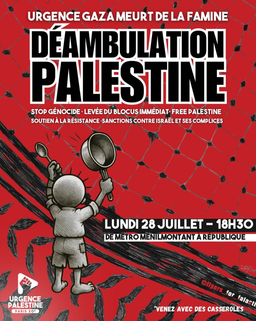 Nous déambulerons ce lundi soir à partir de 18 H 30 au départ de Ménilmontant (métro ligne 2) pour aller jusqu’à République, avec Urgence Palestine 20ème
