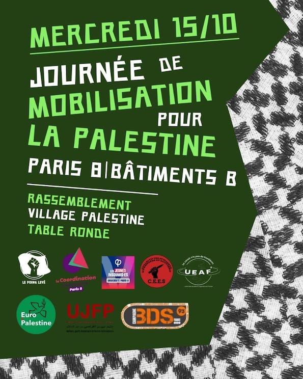 « À l’appel des dockers, de tous les travailleurs et de la jeunesse d’Italie et d’Espagne, depuis Paris 8 nous répondons à leur appel à la mobilisation pour la Palestine ce 15 octobre, car on ne peut PAS ÉTUDIER NORMALEMENT tant qu’il y a UN GÉNOCIDE EN PALESTINE !