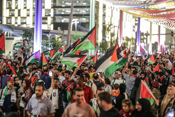 Des milliers de drapeaux palestiniens flottent à Doha, où des fans de toutes nationalités affichent leur solidarité avec la Palestine.